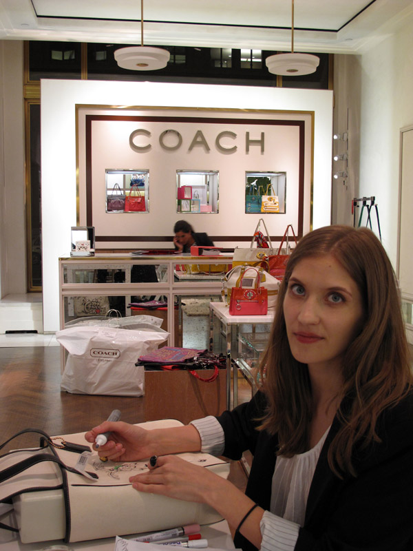 Turns out that after some major practice, I found a method that really seemed to work for me. The girls at Coach were nice enough to send me some test canvas a head of time, so I was able to see what I wanted to use well before the event date. I knew that paint would be way too slow for me, so a friend of mine suggested that I try using paint markers.. After ordering about $200 in various brands and colors, I found a few that I was happy with.